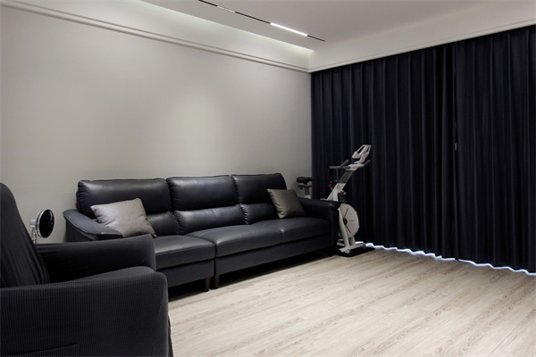 黑色皮革沙發和深色窗簾相互呼應,簡約時尚的單品搭配,在淺色木紋地板和白色漆面的空間里顯得新穎又大氣。客廳電視背景墻與女兒房臥室門結合為隱形門形式展現,整體性非常強,按塊面分割白色飾面板很好的隱藏了門的存在感。