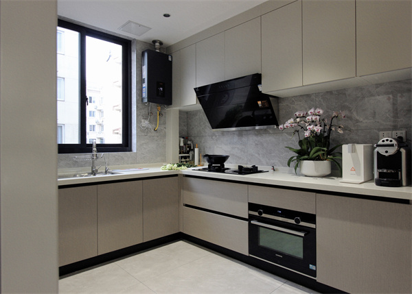 開放式廚房相對于封閉廚房,讓空間變得更開闊,U型的設計讓廚房看起來更方正。廚房采用淺色柜板,白色臺面,搭配灰色墻磚,非常舒適的配色。從廚房到餐廳,從布局到和展示柜收納都實現了業主心中理想高效動線,將空間利用率最大化。