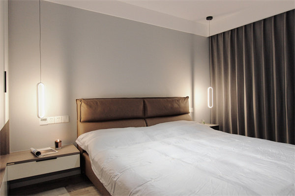 臥室用一盞充滿設計感的燈作為功能性的裝飾,在純凈的狀態之中,尋找美與功能的平衡。整個臥室的基調都是溫暖的,衣柜中間鏤空的展示空間,深棕原木色和床頭呼應統一。金屬環形吊燈微弱的光暈灑在灰色的背景墻上,金屬元素給空間增加了一些時尚氣息,是設計師在現代時尚簡約大氣的完美配合。