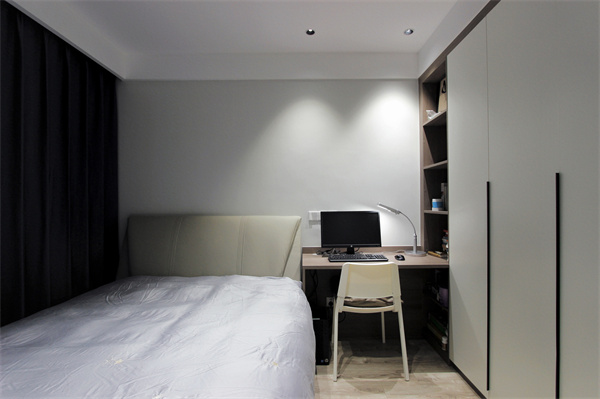 次臥在雅灰的基礎上,增加了大量的木色,燈光的點綴也讓空間更顯溫馨舒適。轉角書桌+衣柜組合,充分利用每一寸空間。
