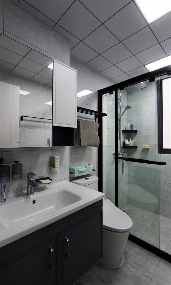 衛生間作為方寸之地,在追求實用功能的同時,黑色玻璃邊框淋浴房和浴盆柜時尚感也隨之up。客衛同樣采用干濕分離設計,玻璃做隔斷,隔絕水汽的同時空間上更加通透明亮。