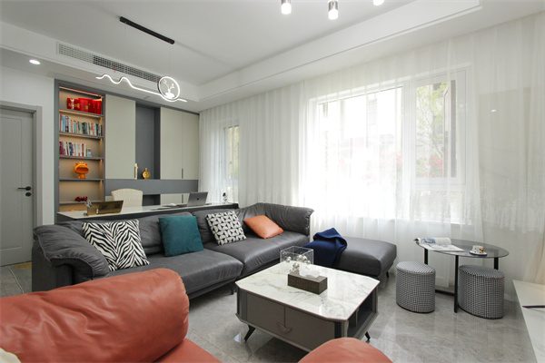 客廳深灰皮質沙發,有著安定平和的內斂美感,搭配不同跳躍的色彩做點綴,大理石臺面茶幾,整個客廳變得非常現代,且不乏享受生活的浪漫質感。大面積的落地窗,裝上紗簾,為客廳提供了充足的采光,結合現代簡約的沙發茶幾,營造出了一個舒適明亮的空間氛圍。