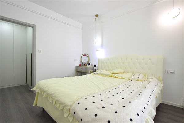 主臥的配色極為清新,黃色與白色拼接,整間臥室干凈清爽,同時也營造出了溫馨的睡眠氛圍。黃色床品搭配黑白波點,淡淡的色彩,清新可愛,一旁的梳妝臺滿足了女主人日常梳妝的需求。女主人對衣物收納的需求空間較大,于是在主臥打造獨立衣帽間,收納空間翻倍。