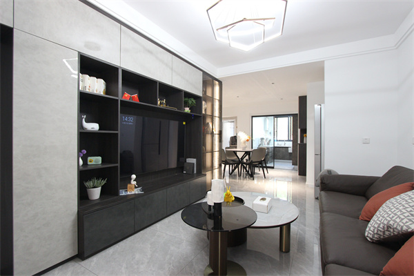 將電視墻以收納柜的形式呈現(xiàn),既滿足了電視背景墻的裝飾性,還能隱藏物品的存放,讓空間更加的干凈整潔。開放格可收納常用物品,取物無需開關柜門,十分便捷。電視墻右側(cè)做玻璃柜門收納,集展示與收納于一體,內(nèi)置燈帶打造良好的視覺美感,高級又有質(zhì)感。