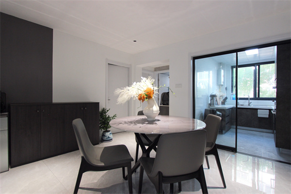 餐廳采用無主燈設計,光線分布均勻而自然;睘楹,返璞歸真,用簡約的設計與合理的燈光運用,打造更舒適的用餐環(huán)境。同時,圓形餐桌配置,提升了空間的流暢性,從而讓生活動線更加的自然、舒適。