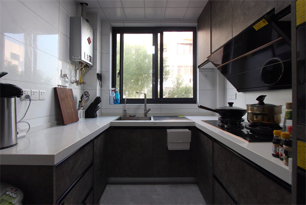 廚房采用U型布局設計,滿足了“取、洗、切、炒、擺”的操作流程。水槽安排在靠窗位置,利于廚具蔬菜等的清洗,更加合理。另外將蒸烤箱、洗碗機內(nèi)嵌在櫥柜一側(cè)里,節(jié)省廚房空間,更加美觀簡潔。
