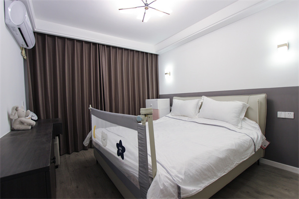為營造靜謐的休憩氛圍,主臥背景墻一半?yún)^(qū)域用灰色粉刷,避免了大白墻的單調(diào)。床品、窗簾也是干凈、素雅的色系,搭配起來仿佛有種隔絕嘈雜的安靜感。床尾對面定制收納柜滿足雜物收納,同時兼顧梳妝臺、書桌等功能,讓空間收納發(fā)揮最大化。