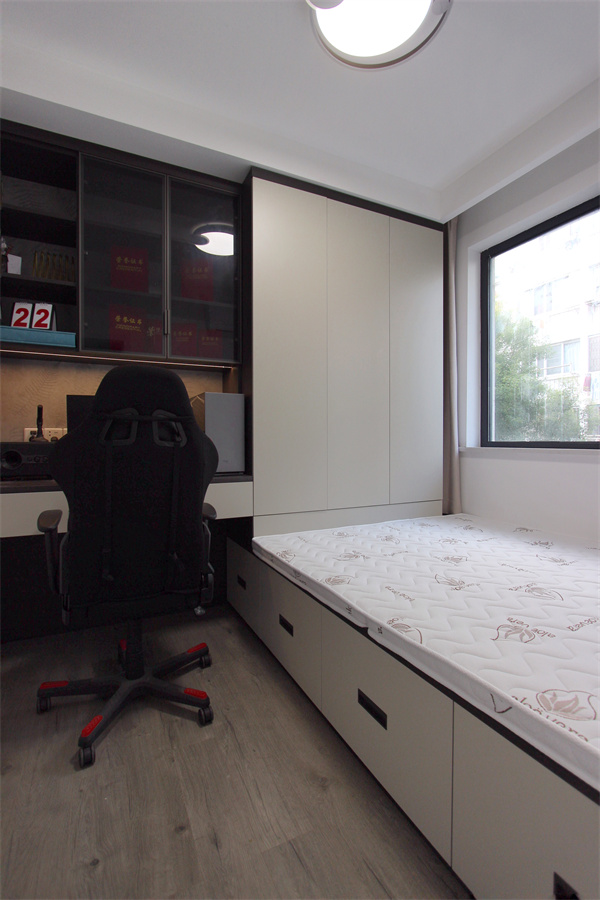 整個戶型南北通透,把原本客廳空間進行簡單的整理和改造,達到空間的開闊、 舒適。室內(nèi)砌墻隔出一個單獨的次臥空間,滿足日常生活的同時,也方便收納。同時打造榻榻米房,用來放書桌,滿足學習、辦公需求。