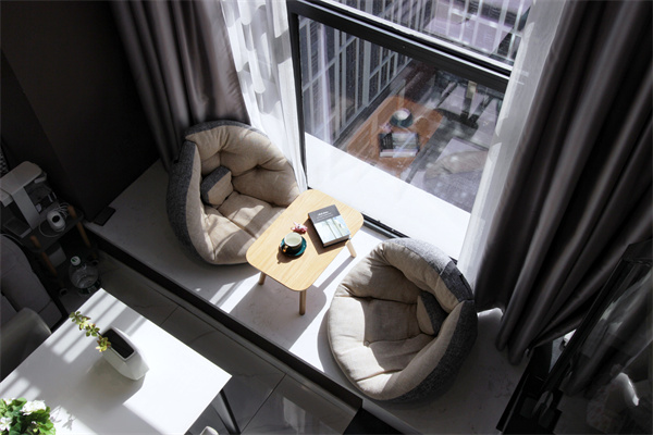 電視背景墻以大理石上墻,兩側護墻板內做燈帶設計,夜幕降臨,浪漫溫馨。后方的飄窗臺,放上軟墊與小木桌,作為休閑區(qū),隨手翻看一本書,再倒上一杯自制奶茶,愜意美好。