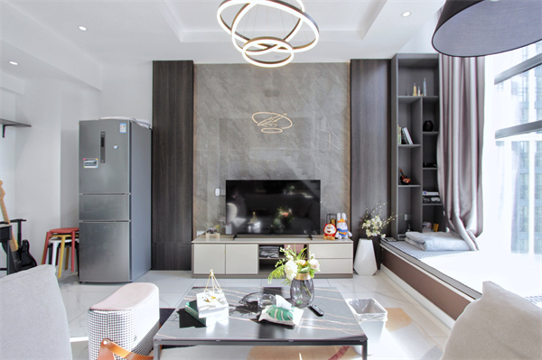 陽光是大自然創(chuàng)造的最純粹的藝術品,它總會以各種形態(tài),來到你的身邊,擁抱你?蛷d保留雙飄窗,讓整個屋子能更透徹的浸潤于這溫暖的饋贈中。被陽光浸潤的客廳通透明亮,飄窗臺做壁龕設計,收納一些常用的書籍及旅途中收集的紀念品。