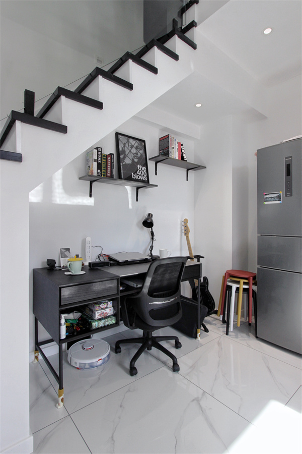 作為二人世界的小屋,男主人的辦公區(qū)域也必不可少,設計師在樓梯下辟出一塊用于辦公的區(qū)域,是一個互通而又互不打擾的小空間。