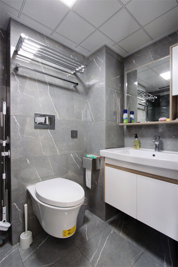 一樓衛(wèi)生間為客衛(wèi),嵌入式水箱節(jié)約空間成本,設計師利用空間特質分配功能區(qū)域。