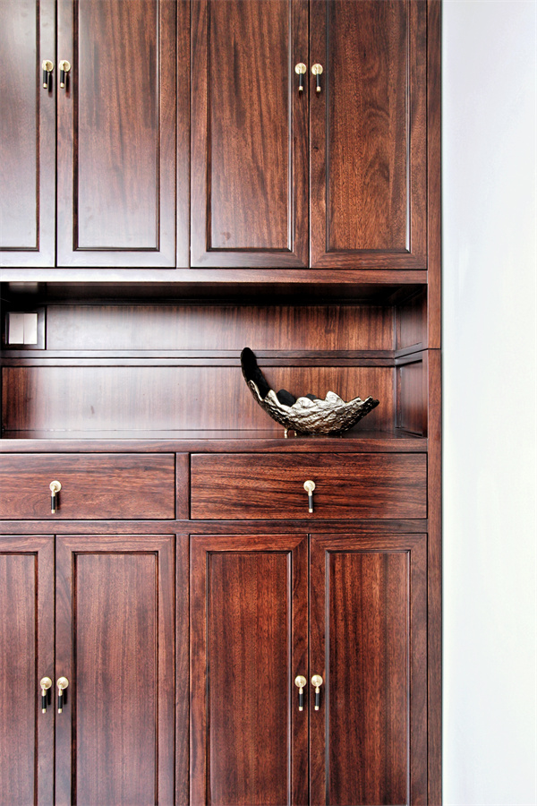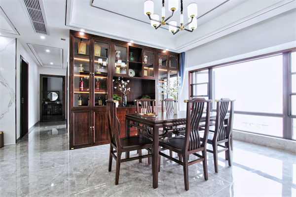 新中式風格的餐廳以紅木材質的家具為主,六人座的方桌更符合業主的家庭需求。全屋采用中央空調以及新風系統,避免了壁掛空調或立式空調的空間占用和風格破壞。靠北邊的餐廳同樣也擁有一整面的落地窗,為室內攬入更多自然光的同時,加強了整體空間的明度。餐邊柜兼備酒柜功能,將收藏與收納做到一體化,內置燈帶豐富視覺感。