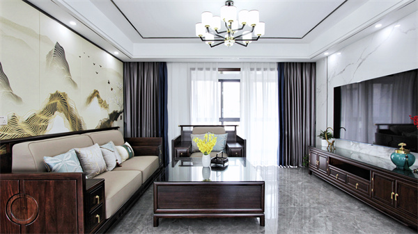 沙發采用黑檀木材質,沉穩內斂,給人靜謐平和的舒緩感覺,搭配朦朧山鳥軟包背景板,營造雅致意境。地面通鋪大理石地磚,吊頂以黑色線條勾勒,使客廳整體簡潔且清冽。