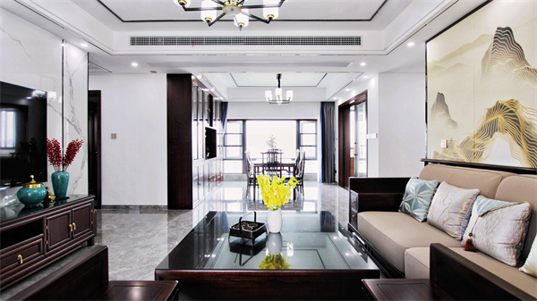 由玄關走廊入戶后,迎面而來的就是客餐廳一體的活動區域,中央空調設計,以走廊進行空間分隔。充滿東方意境的客廳空間,白凈如潑墨山水畫般,透過內涵,使之更加豐富細膩。