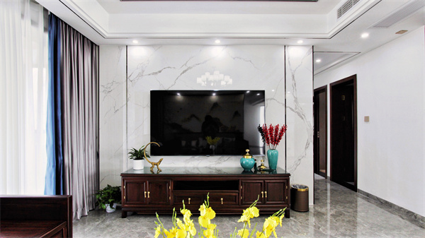 電視背景墻采用大理石上墻,兩側雕刻黑色線條增加空間層次感。而站下沙發一側的視角,能將客餐廳整體空間一覽無余,完整的體現了空間的交流性。