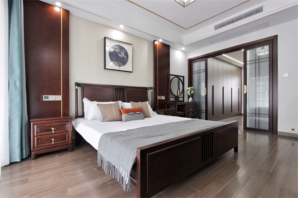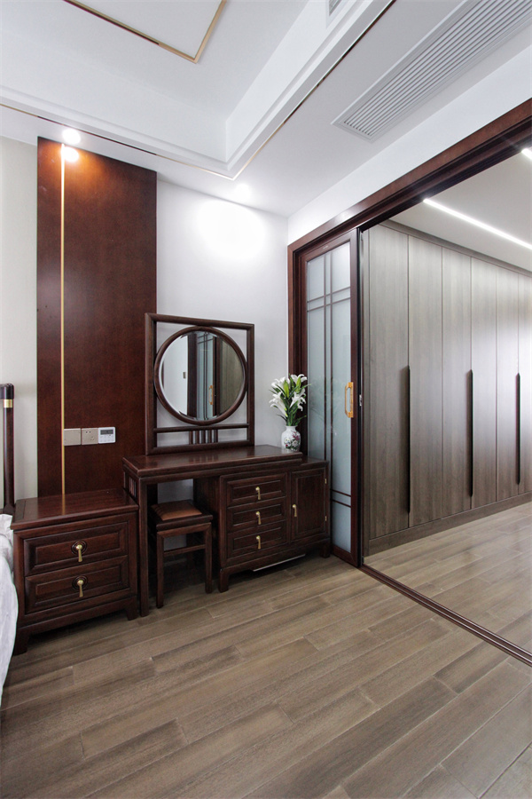 主臥利用濃厚的紅木色調與淡雅的白色調進行搭配,營造典雅有格調的居室環境。梳妝臺設置于床的旁邊,靠近獨立衣帽間,梳妝換衣十分方便。