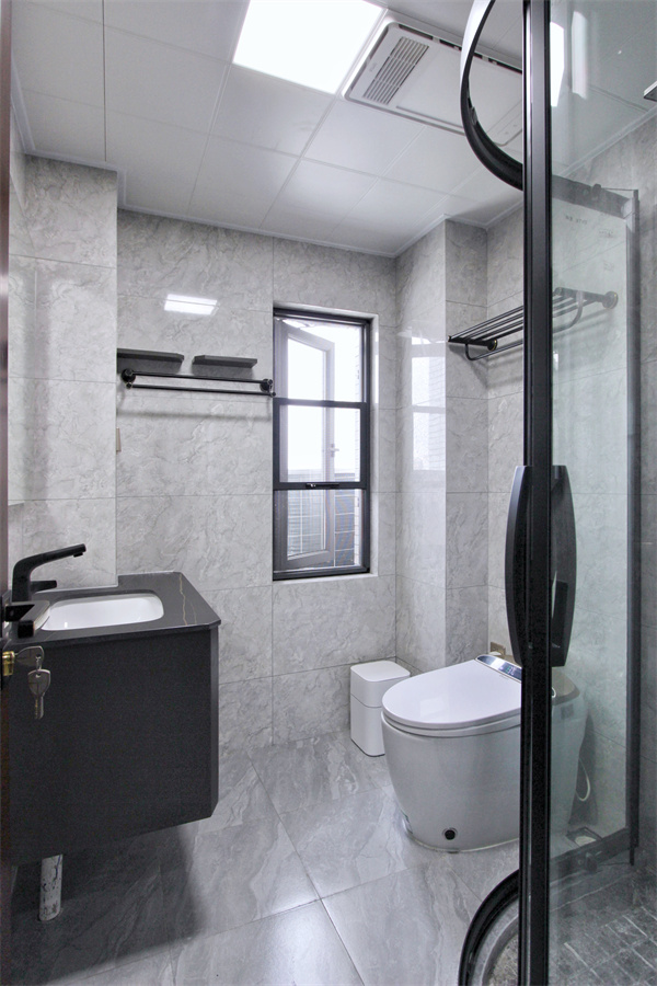 黑白灰色調為主的衛生間空間,不占據太大的空間,金屬的硬朗感,塑造更符合人居生活的空間。