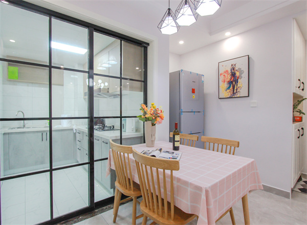 廚房空間收納充足,使廚房空間整潔統一。玻璃移門使空間更加通透寬敞,更加開放。