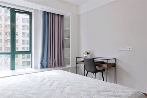 飄窗一側設計壁龕,放置業主平日喜愛的讀物,梳妝臺也置于一角,自然光線充足。