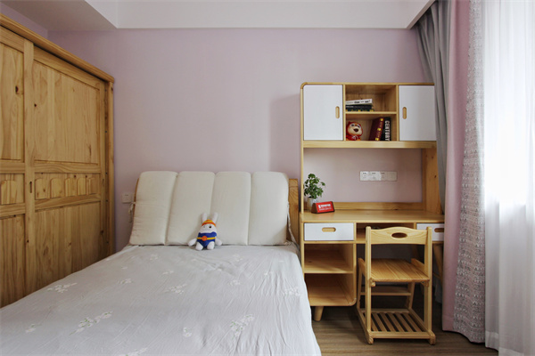 兒童房家具采用的是原木成品定制柜,兒童房更講究環保,原木質地更加原始自然。小小的衣柜讓孩子有自己獨立的儲藏空間,自由的安排自己的衣物。床頭一旁是學習書桌柜,床尾放置帶有抽屜的五斗柜,小小角落,大大用處。