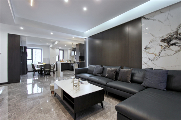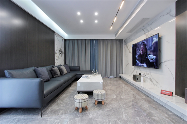 客餐廳地面通鋪灰色大理石地磚,無線條分隔,整體統一美觀,屬時下流行。無主燈設計,以磁吸燈與筒燈為主照明,吊頂處與沙發背景加以燈帶處理,增加空間層次感。