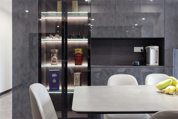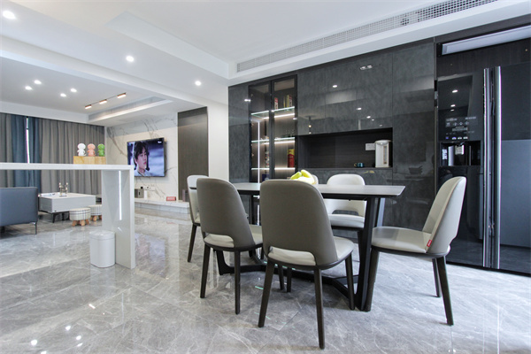 餐邊柜為深色定制櫥柜,透明展示格內置燈帶,放置業主自己收藏的白酒與酒杯。而另一側將冰箱內嵌,雙開門冰箱內置制冰機,也是生活品質的體現。餐邊柜與廚房廚柜均為暗色系,搭配白色系吊頂與墻面,讓空間更有層次感。