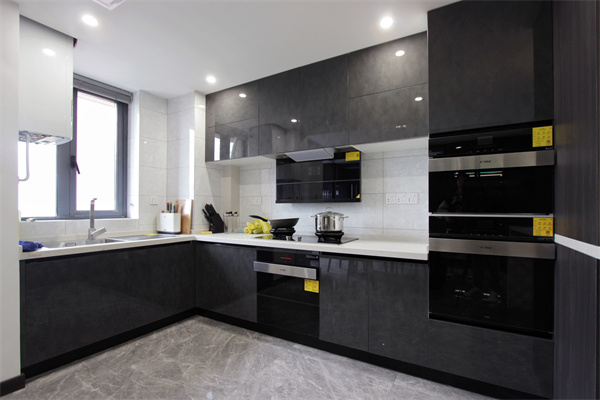 開放式廚房墻面以瓷磚為主,避免油煙污染,難以清理,與玄關客廳的吧臺隔斷,是廚房成為一個獨立空間。蒸箱、烤箱、洗碗機內嵌柜體之中,避免了電器的雜亂擺放,增加空間之需。深灰色系櫥柜有種典雅高貴的美感,無拉手的設計,更是使廚房空間變得簡潔明了。