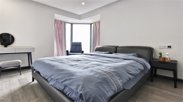 朝南的主臥空間并不算方正,角落為異形小陽臺,設計師為了體現空間整體性,將其攬入室內空間。床體的擺放正好避免了濃烈刺眼的陽光照射,卻也能在第一時間被清晨叫醒。
