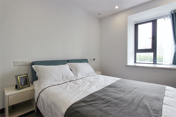 次臥以簡潔樸素的白色為主,拒絕繁復的設計,讓睡眠空間更加純粹。乳白色床頭柜與整體色調搭配,棕木色的木地板給室內增添溫馨與舒適。