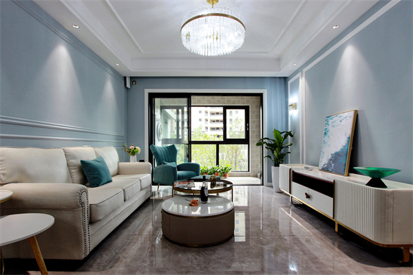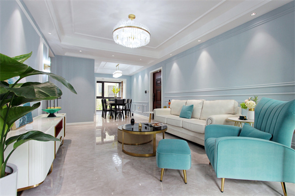 客廳墻面使用淡雅的水藍(lán)色,像天空般清冷,似海風(fēng)般閑適,穩(wěn)重又清新。又顯得十分靜謐,安撫著人們的心情,令人放松。沒有過(guò)多的修飾與約束,是美式自在隨意的生活方式,刻畫的是一種休閑式的浪漫情調(diào)。