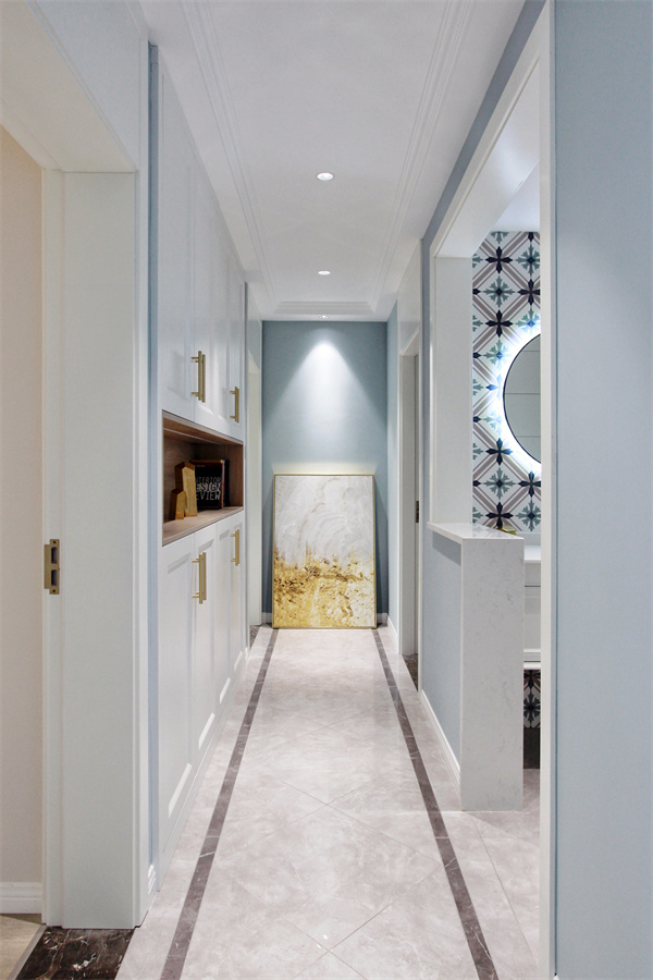 走廊與入戶門相對(duì),給空間一絲遐想。走廊狹長(zhǎng),正面地磚鋪貼會(huì)顯得沉悶,設(shè)計(jì)師在地磚的鋪貼上采用菱形貼法,在視覺上增加一些延伸感。