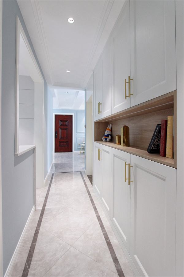 設(shè)計(jì)師利用走廊空間,為業(yè)主設(shè)計(jì)了一處收納空間,白色柜體與金屬把手,簡(jiǎn)潔明了。再加之以中空展示柜,擱置一些隨手物品,或是房上擺件書籍,也未嘗不是一件有趣的事。