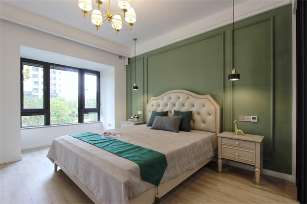 主臥采用業(yè)主喜歡的墨綠色,包括在軟裝布藝上的搭配,與整體色調(diào)統(tǒng)一,增加臥室靜謐感。床頭背景墻同樣采用石膏線修飾,在面上尋求變化,軟包布藝床頭增條美式情調(diào)。