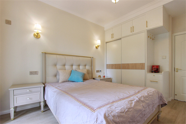 次臥整體為暖色調(diào),簡(jiǎn)潔無(wú)吊頂,暖色墻面漆搭配暖色燈光,在視覺上使臥室空間溫暖舒適。將換季衣服收納于衣柜頂部,常用衣物掛在衣柜里,一切整潔有序,入室衣柜轉(zhuǎn)角處設(shè)計(jì)掛鉤與抽屜置物架,功能十足。