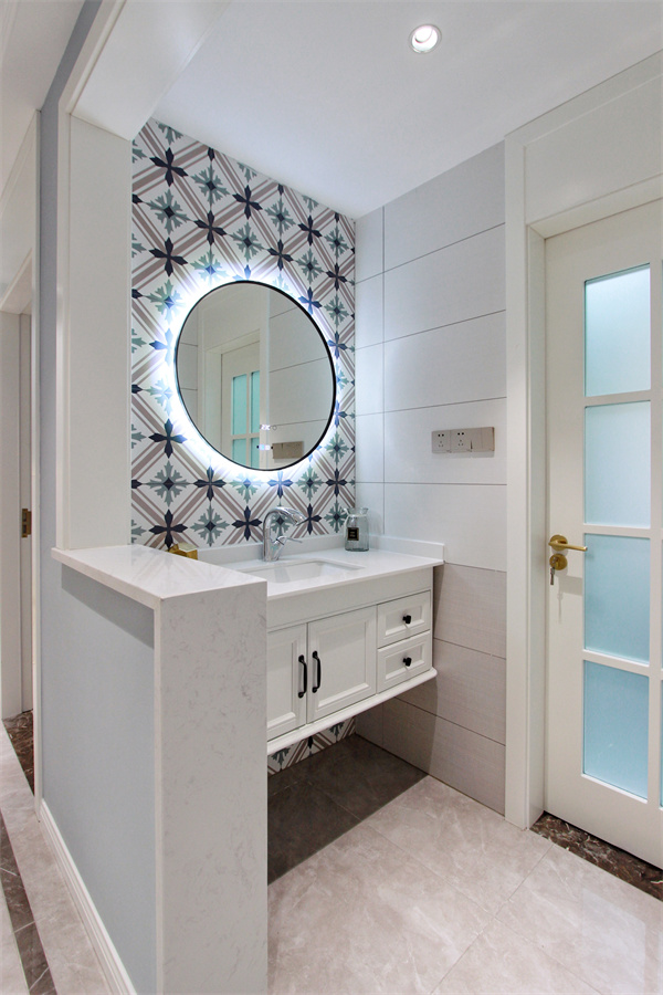 主衛(wèi)外部分離出一個(gè)獨(dú)立臺(tái)盆區(qū),半開放的洗手區(qū)空間增強(qiáng)視覺感,墻面花磚趣味十足。內(nèi)干濕分離,內(nèi)部另配備獨(dú)立臺(tái)盆,色調(diào)統(tǒng)一明快,抽拉式水龍頭更符合業(yè)主需求。