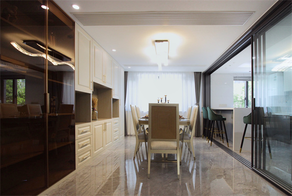 靠在飄窗邊的餐廳,擁有更加明媚的陽光和更加舒爽的輕風。在享受美味的同時,也能領略窗外的美景,擁有視覺和味覺的雙重享受。連含過道空間與餐廳,將整面墻設計收納柜,部分黑色玻璃柜,最大化增加室內收納空間。