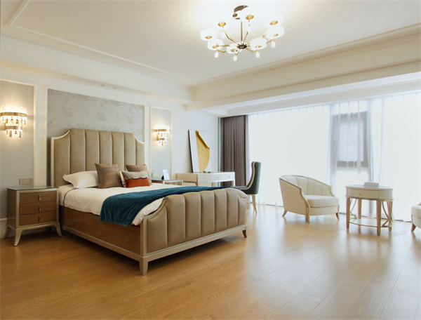 美式實木抽屜柜,有序安放大小物件,實現大容量分類儲物。抽屜柜與床頭柜相呼應,利用好的材質提高整個空間檔次。