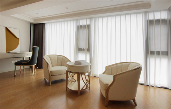 超大落地窗讓主臥空間更顯寬敞明亮,擺上兩張休閑單椅,變成一處愜意的休閑區。角落打造安靜的閱讀區,陽光灑進來,一杯咖啡,一本書,可以坐一下午。