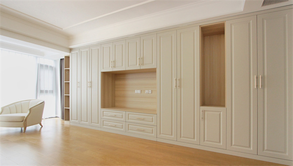 一整墻衣柜設計,儲物空間十足。柜子以封閉式為主,打造不同分區,局部鏤空可放置擺件、隨手物品,整體美觀又實用。