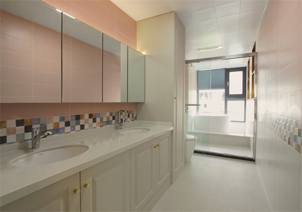 內衛同樣是雙臺盆設計,白色洗漱柜搭配粉色墻磚,配色十分少女,收納功能也是非常齊全。靠窗位置配備浴缸,并安裝百葉窗便于調節光線。白天光照進衛生間有助于防潮,夜晚泡澡的時候還可以欣賞外面的風景,一舉兩得。