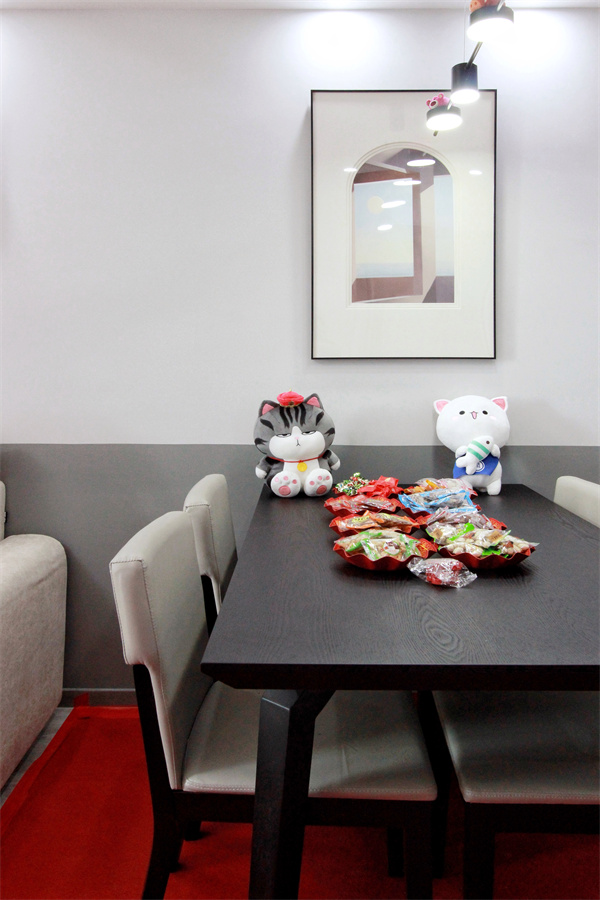 本案業主為新婚夫妻,這套房也是為了新婚而準備的,兩位業主都非常喜歡貓,家里無論是燈具還是桌面上,都有小貓玩偶的裝飾,裝點著他們的幸福。