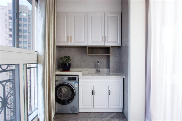 陽臺設置洗衣區,結合收納與功能性,吊柜底部設計開放格,放置常用物品格外方便。另一側為整面收納柜,更注重實用性,嵌入式的設計讓空間更為合理。