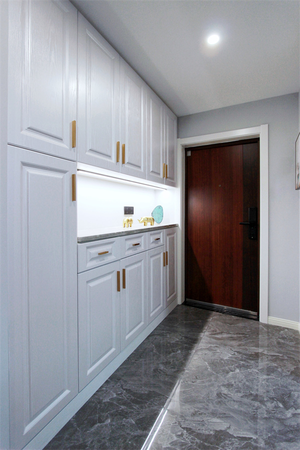 純凈白色的墻頂面和大理石紋地磚使空間嚴謹有序,搭配抽象壁畫,使色彩在空間中延伸碰撞。設計師充分利用入戶的墻面空間,整面收納玄關柜使空間井然有序。