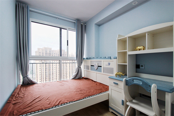 男孩房是整面落地窗,拉開窗簾,視野上更加開闊,藍色調的房間是男孩子的心頭好。城堡墻壁造型的床頭,增添了更多的童趣,搭配藍色書桌椅,讓孩子更加自由的成長。