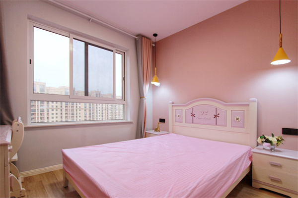 以輕盈夢幻的淡粉色為主調的居所,清新又溫柔,功能和實用為主的同時,迎合了女兒對新房間的期待。女兒的書桌房在床尾處,讓無論是學習還是休息,都有自己獨立私密的空間。豐盈的臥室空間,喚起每日活力,粉色床頭墻面配合燈光,營造柔和的氛圍。