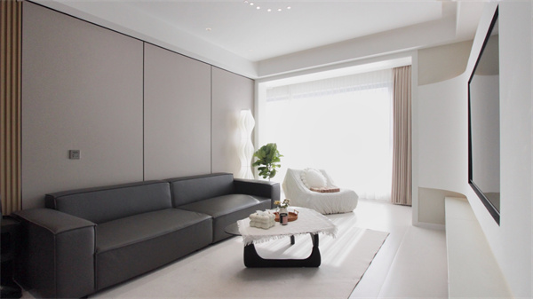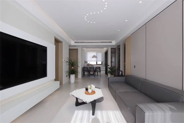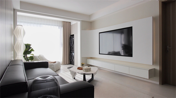 電視背景墻是整個(gè)空間的一大亮點(diǎn),做弧形設(shè)計(jì),圓潤(rùn)的曲線代替尖銳的方角,使空間的氛圍感更加溫柔浪漫。弧形石膏電視背景墻,創(chuàng)造“懸浮”既視感,上下內(nèi)嵌燈帶,簡(jiǎn)約且高級(jí)。一字型懸空電視柜不占地,基本上不會(huì)留下衛(wèi)生死角,掃地機(jī)器人可以自由出入進(jìn)行清掃,讓客廳空間時(shí)刻保持干凈整潔。