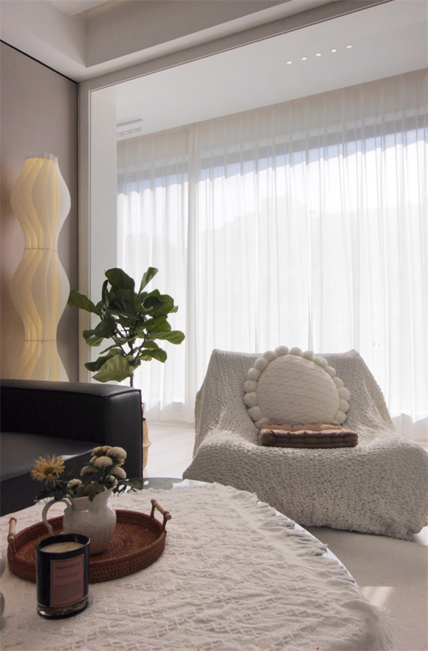 沙發(fā)背景墻采用三塊飾面板進(jìn)行鋪裝打造,并輔以格柵裝飾,顯示出溫潤(rùn)自然的底色?牡靥骸⒉AЩㄆ亢突ㄊ、簡(jiǎn)易的落地?zé)暨有一張簡(jiǎn)易茶幾,每一個(gè)細(xì)節(jié)都透出奶奶的氛圍感。