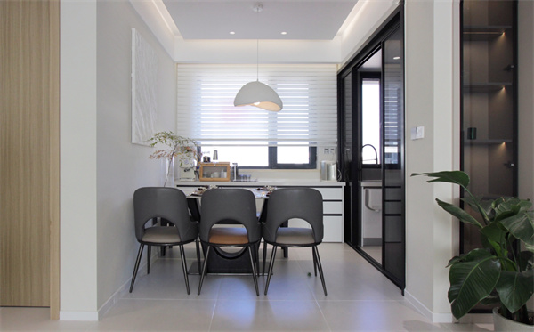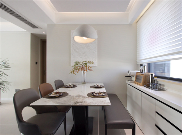 選用詫寂風(fēng)奶油吊燈,微水泥材質(zhì)設(shè)計(jì),其細(xì)膩肌理與暖調(diào)燈光相遇時(shí),為空間增添不少氣氛,真正實(shí)現(xiàn)美與生活的平衡。巖板桌面賦予了餐敘空間一抹高端的氣質(zhì),再加上適時(shí)更換的綠植,餐敘之時(shí)也能幸福感滿滿。