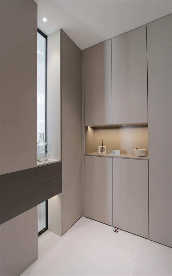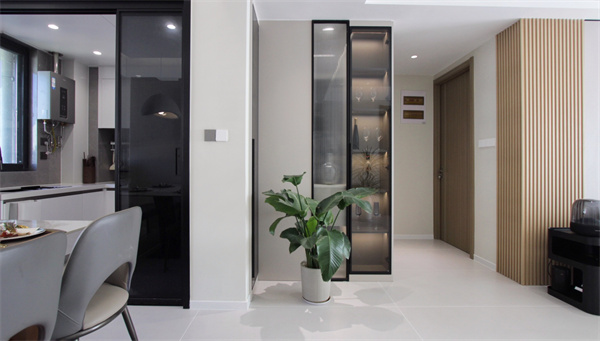 另外在玄關(guān)處打造了一組玻璃酒柜,柜體內(nèi)的燈光讓整個(gè)酒柜內(nèi)的物品一目了然,增強(qiáng)了空間的裝飾感與層次感。